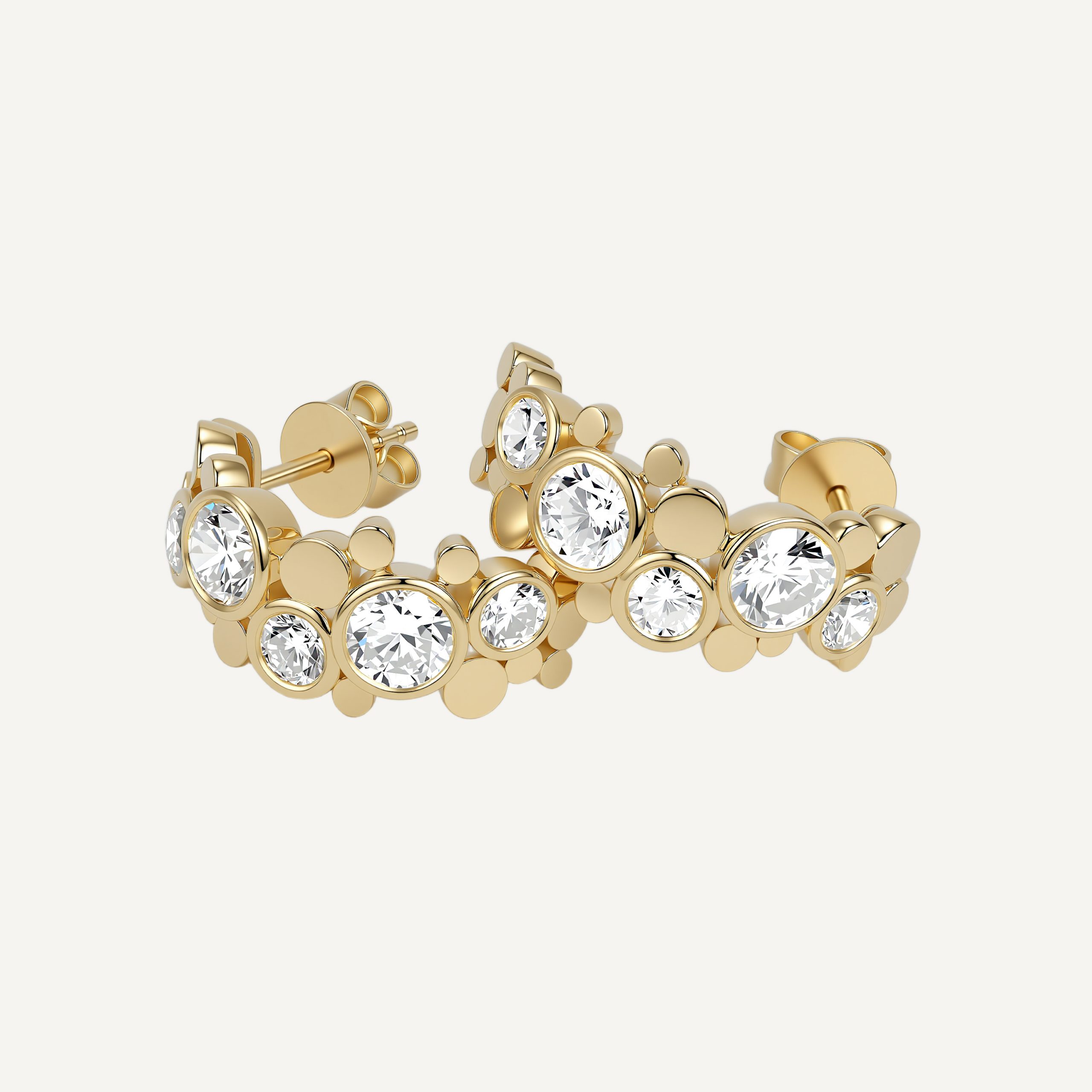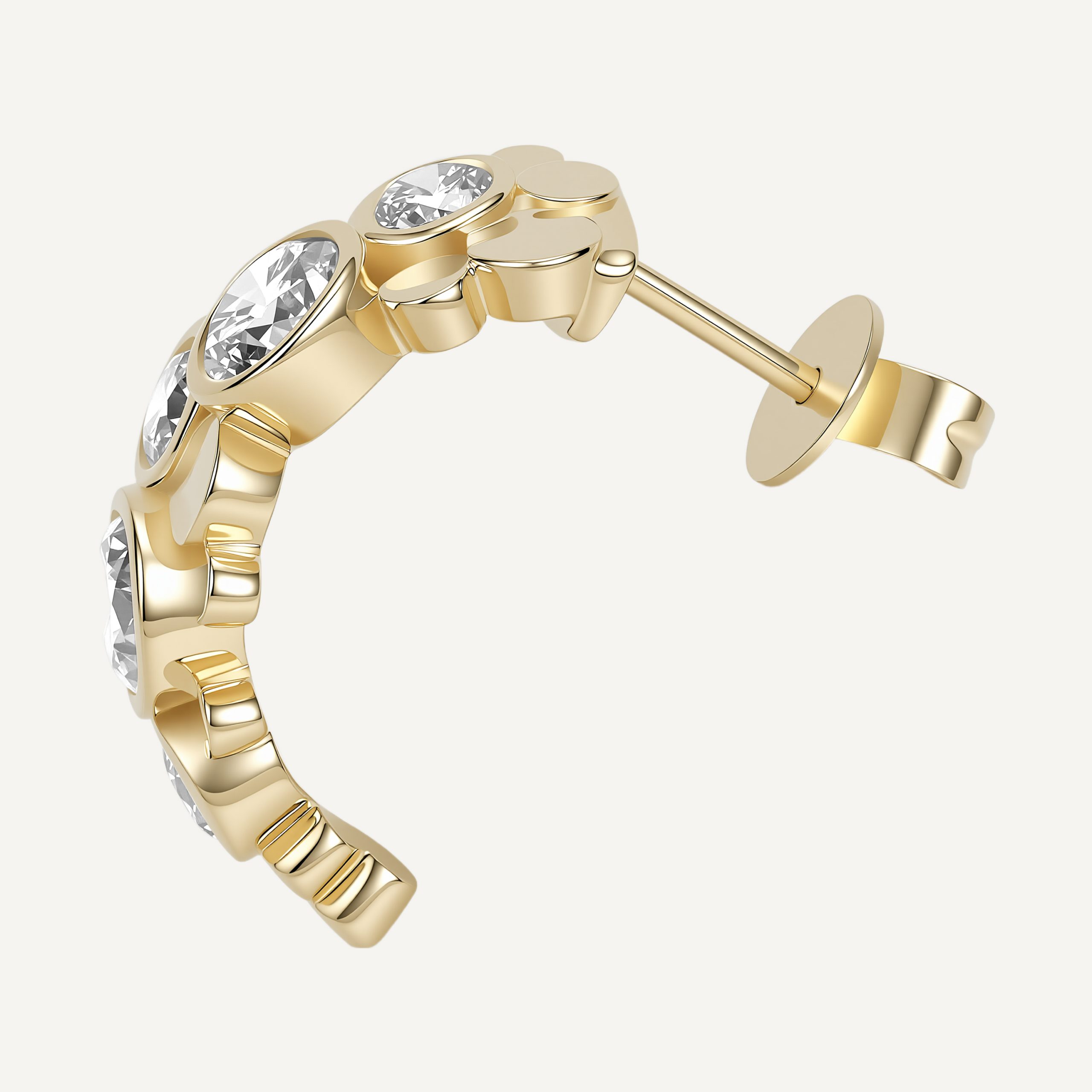 Inspired by geometric circular aesthetics, this pair of earrings is crafted in 14k gold and features five round brilliant-cut lab-grown diamonds of varying sizes, connected by staggered, three-layer disc elements. The earrings are designed in a semi-hoop structure, with a smooth gold surface. The clean lines and exquisite diamonds perfectly blend modern industrial style.