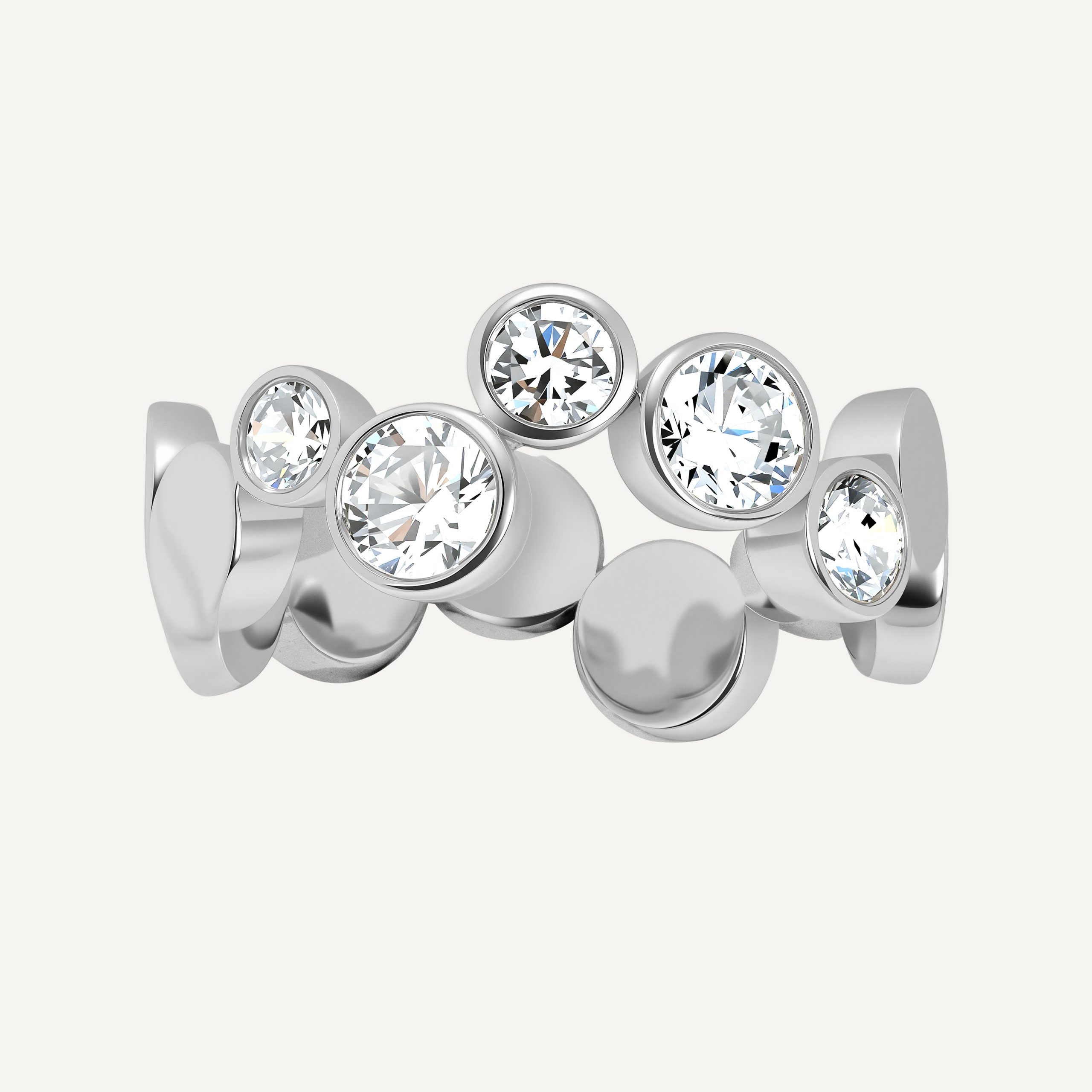 Inspired by geometric circular aesthetics, this 14k white gold narrow band ring is set with five round lab-grown diamonds of varying sizes, connected by staggered, single-layer disc elements. The design is simple and modern, with smooth lines and a sturdy structure, presenting a minimalist yet refined industrial style.