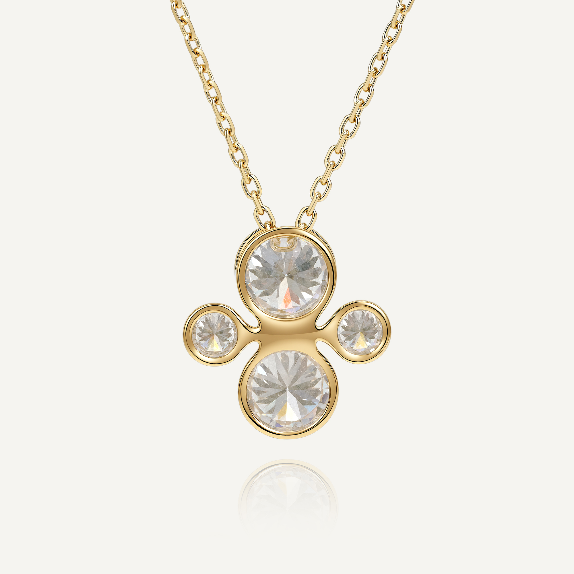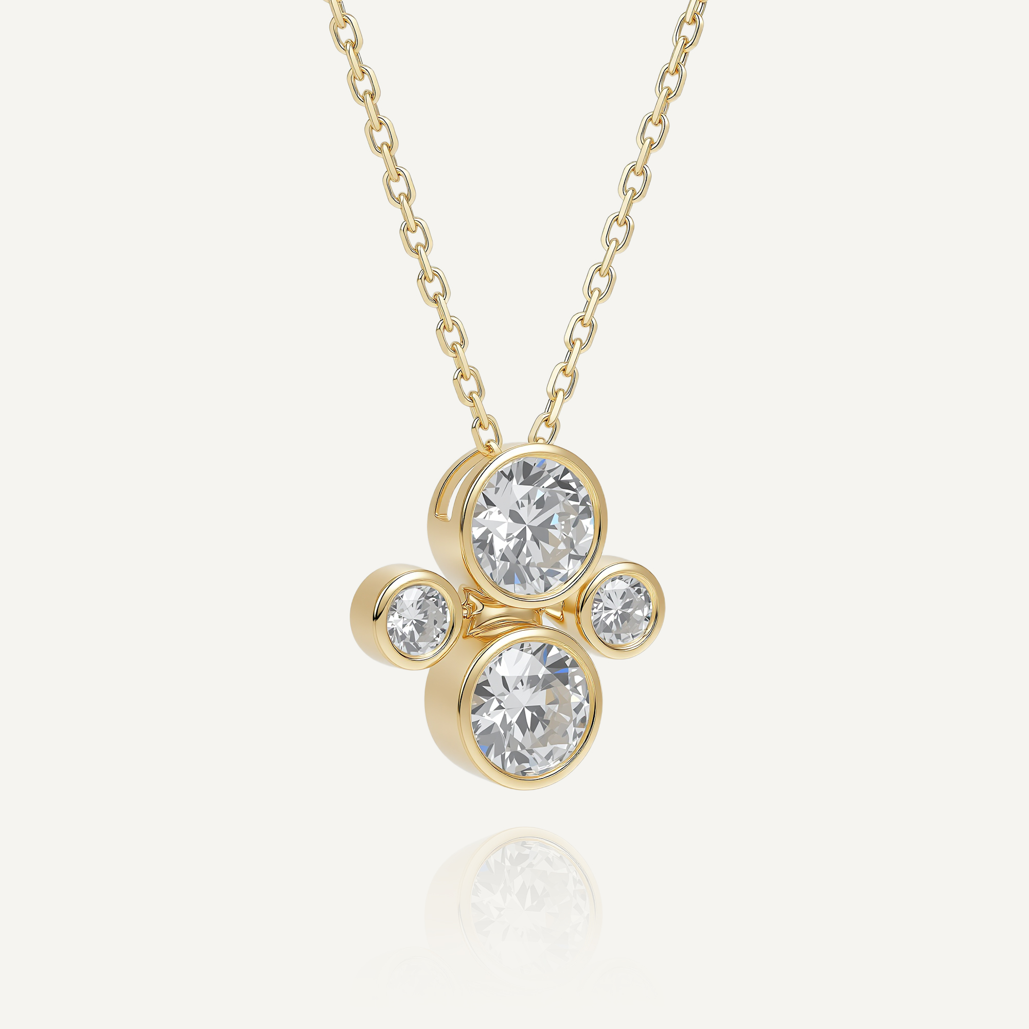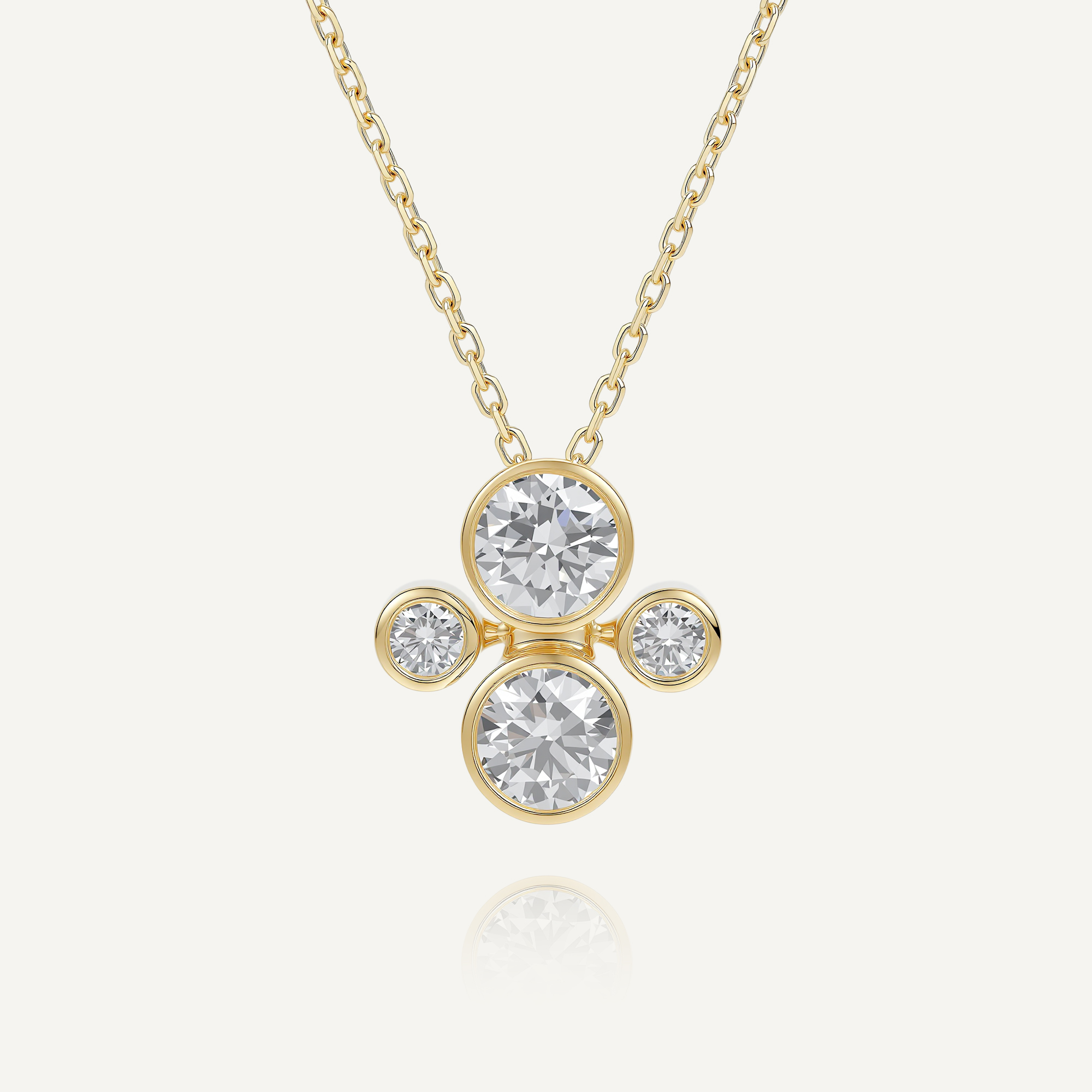 Inspired by geometric circular aesthetics, this necklace pendant is crafted in 14k gold. The pendant is set with two large diamonds and two small diamonds, cleverly arranged in a square shape. The diamonds are set in a bezel setting, showcasing a simple yet refined sense of layering.