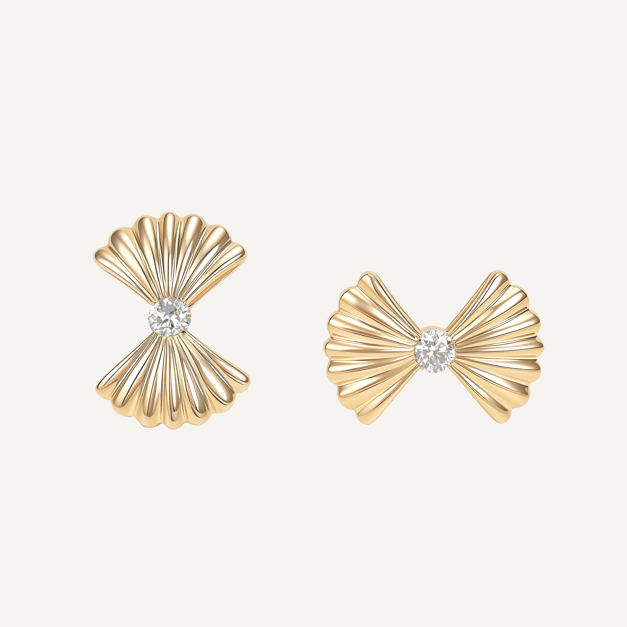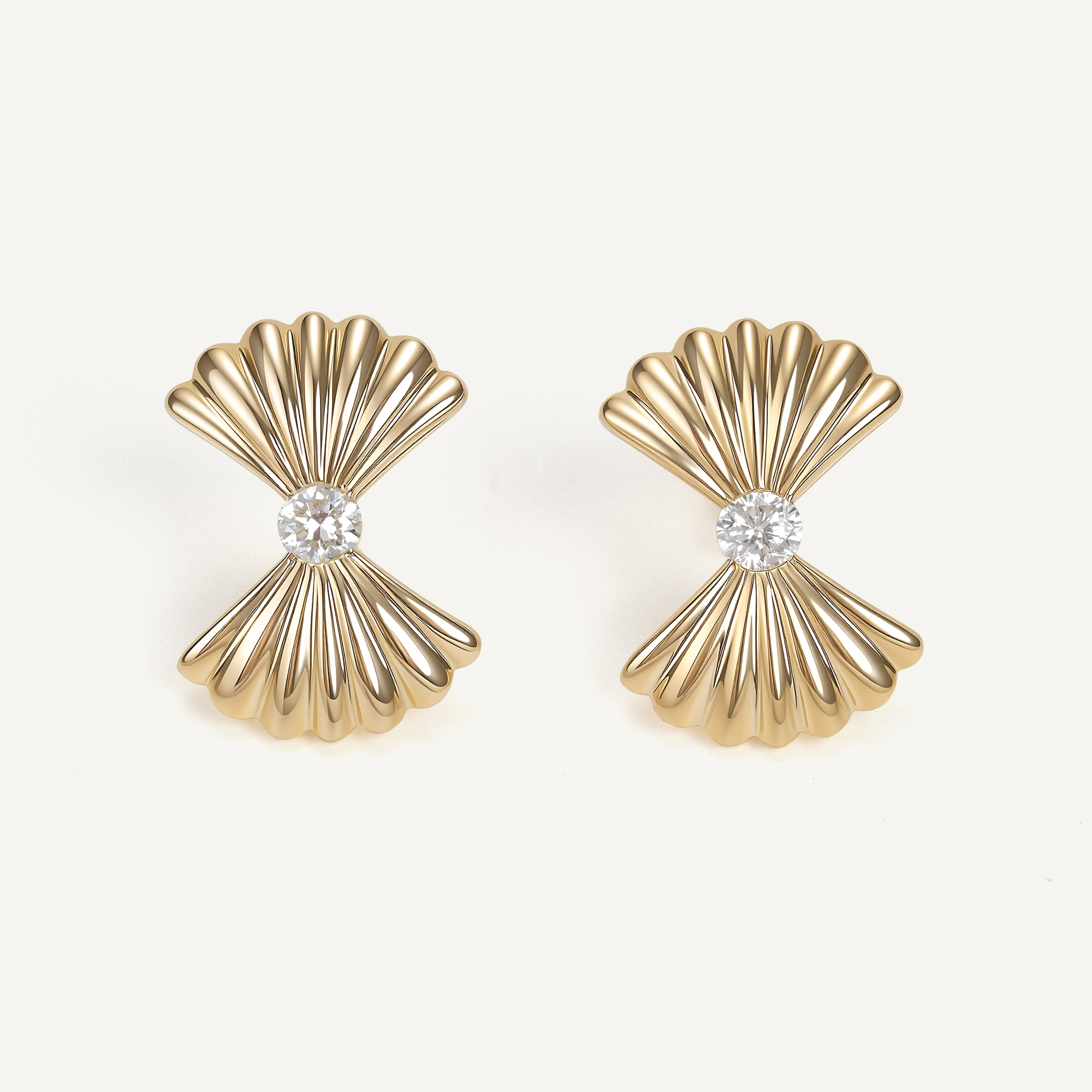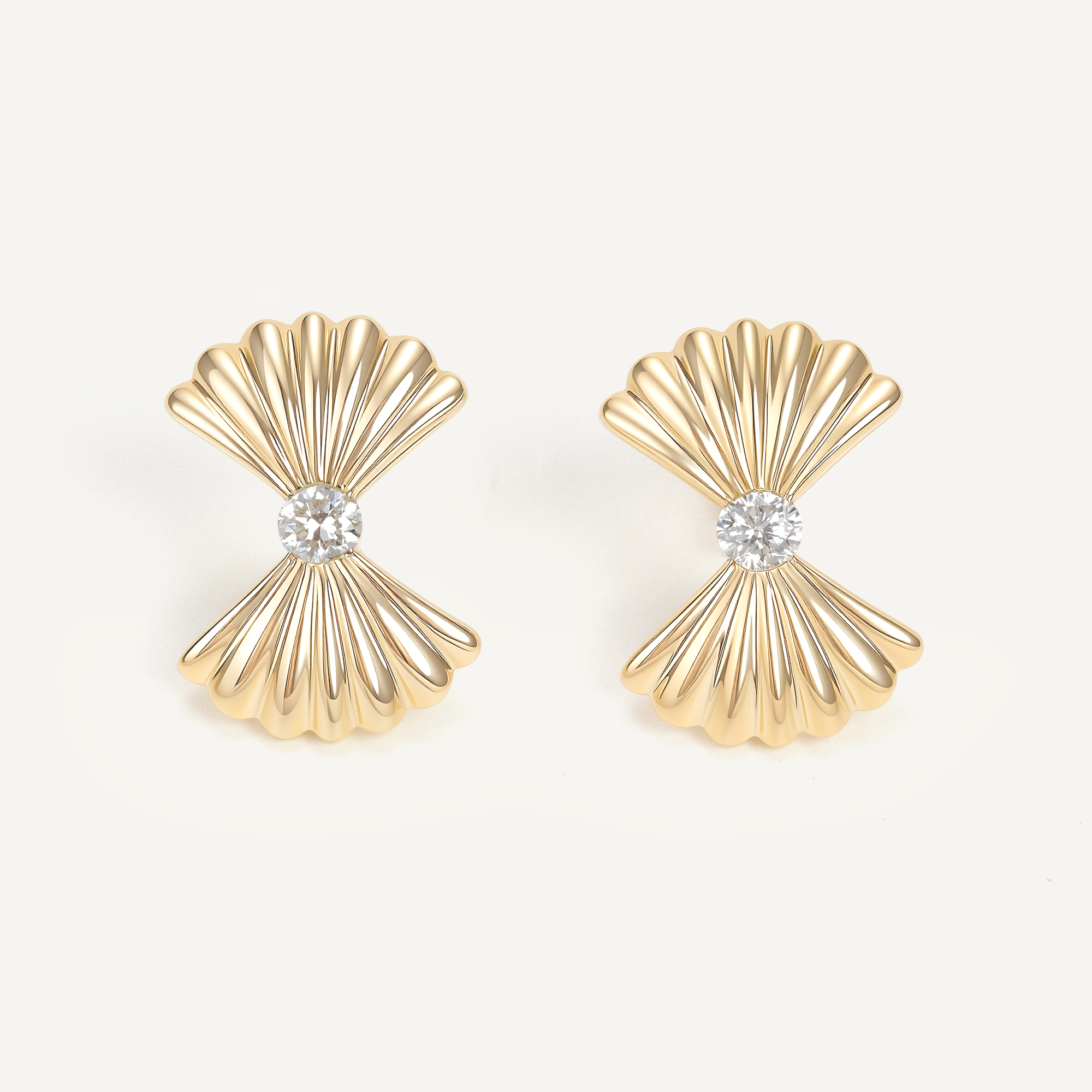 Inspired by the shape of seashells, these earrings are crafted in 14k gold. Each earring features a round diamond at the center, surrounded by intricate radiating metal lines, creating an elegant wave-like design. Simple and modern, they express unique layering and exquisite craftsmanship.